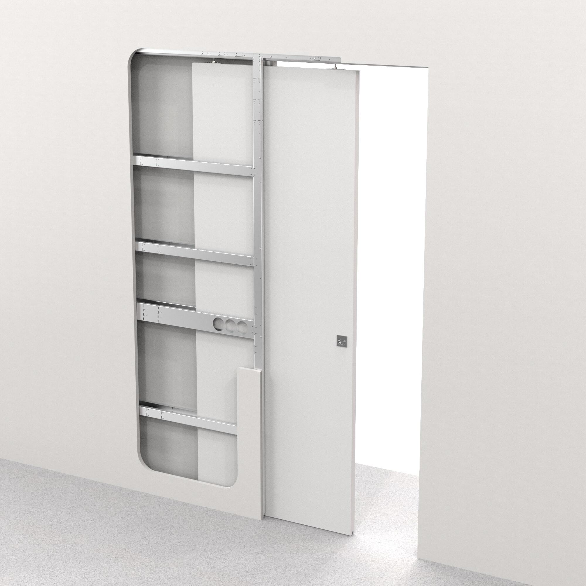 В открытом положении полотно полностью скрыто в стене, освобождая проём.