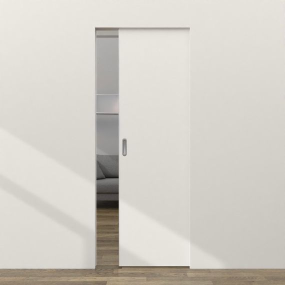 Дверь движется по верхним направляющим, плавно скользя внутрь стены.