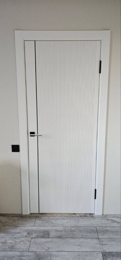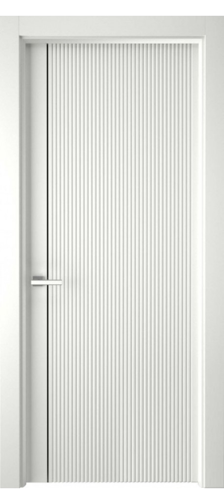 Эта межкомнатная дверь — образец современного минимализма. Глухое полотно украшено тонкими вертикальными линиями, которые добавляют текстуру, не перегружая дизайн. Чёрный молдинг создаёт стильный контраст с белоснежным покрытием. Идеальное решение для интерьеров в светлых тонах, где ценится лаконичность и элегантность
